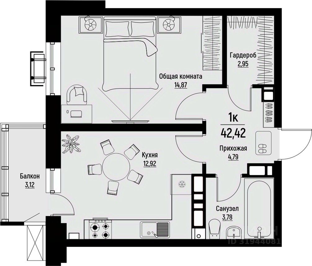 Общая площадь42,42 м²