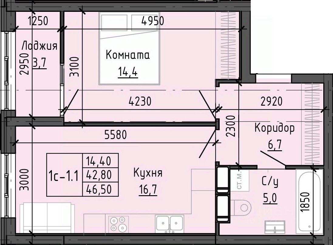 Общая площадь46,49 м²