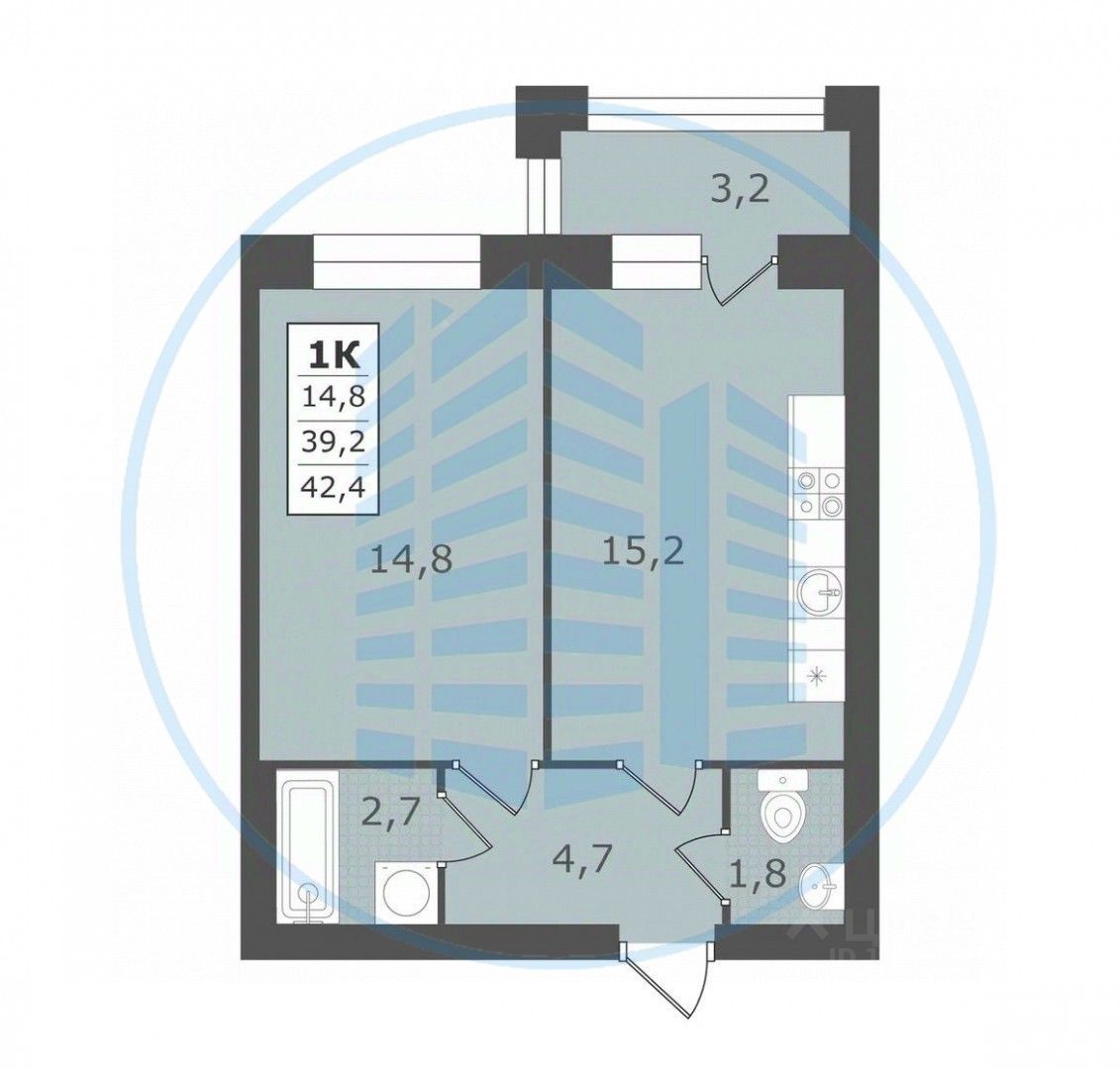 Современная планировка, кухня-гостиная 17.5м², спальня с выходом на застекленный балкон, гардеробная 4.1м², совмещенный санузел.