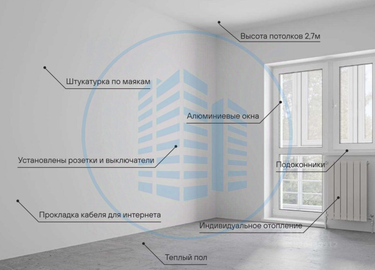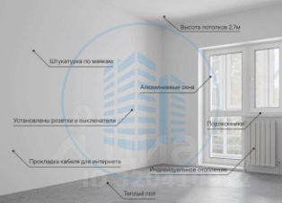 Предчистовое состояние: разводка электричества и отопления. Выполнена стяжка пола, теплые полы, стены выровнены под обои, установлены розетки и выключатели, подоконники и радиаторы.