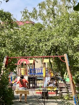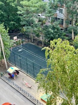 В доме установлено видеонаблюдение, во дворе дома расположены детский сад и школа ( на которые выходят окна квартиры). Во дворе дома детская и баскетбольная площадки, достаточно парковочных мест. Дом расположен внутриквартально, не над дорогой, окна выходят на обе стороны.