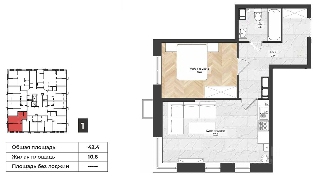 Общая площадь42,4 м²