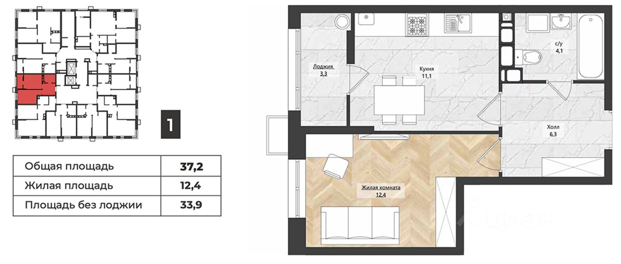 Общая площадь37,2 м²