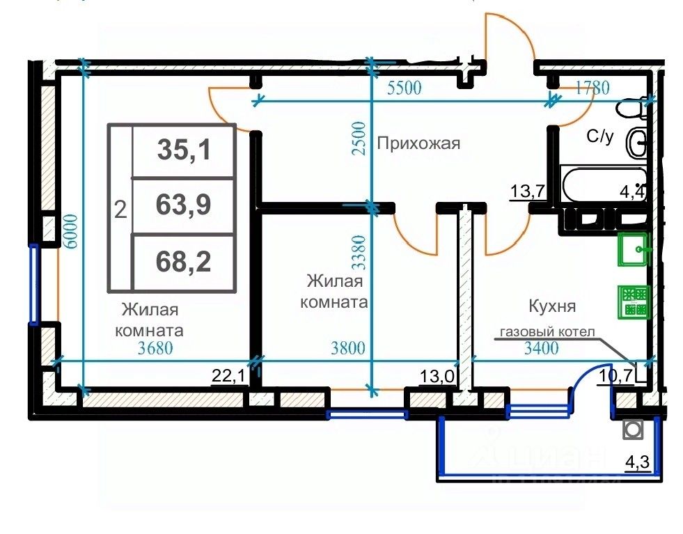 Продаётся 2-комнатная квартира в сданном доме (Маяковского, 19А), срок сдачи: IV-кв. 2024, общей площадью 68.2 кв.м., на 1 этаже.