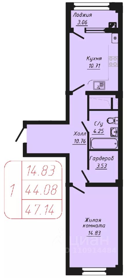 Продаётся 1-комнатная квартира в строящемся доме (Секции 1-3), срок сдачи: II-кв. 2028, общей площадью 47.14 кв.м., на 4 этаже.