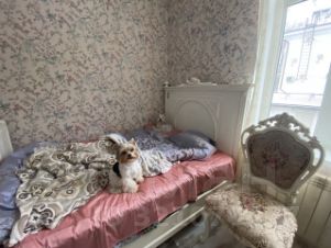 Спальня с окнами в тихий сад даже в жару не требует кондиционера, как, впрочем, и вся квартира: солнце здесь в гостиной и кабинете утром до 12 часов , а потом прячется за вековые деревья и создает приятную тень.