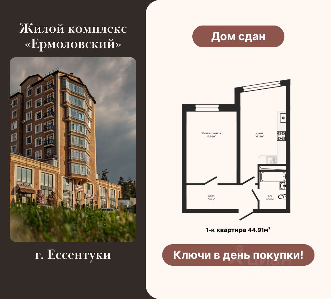 Продается 1-комнатная квартира в сданном доме жилого комплекса "Ермоловский", г. Ессентуки. Ключи в день покупки! Комфортная жизнь в курортном городе с чистым воздухом и развитой инфраструктурой О жилом комплексе "Ермоловский": Жилой комплекс расположен в г.Ессентуки, в одном лучших курортов Кавказских Минеральных Вод. Чистый воздух, мягкий климат, много зелени и парков Знаменитые источники минеральных вод и санатории — всё рядом. * Современный монолитно-кирпичный дома * Панорамное остекление * Индивидуальное отопление * Закрытая охраняемая территория * Детские, спортивные площадки и места для отдыха прямо во дворе * Парковочные места * Школы, детсады, спорткомплексы и всё для комфортной жизни семьи * Из окон — красивый вид на город и горы Прямая продажа от застройщика. Индивидуальные условия оплаты: ипотека, рассрочка, полная оплата.
