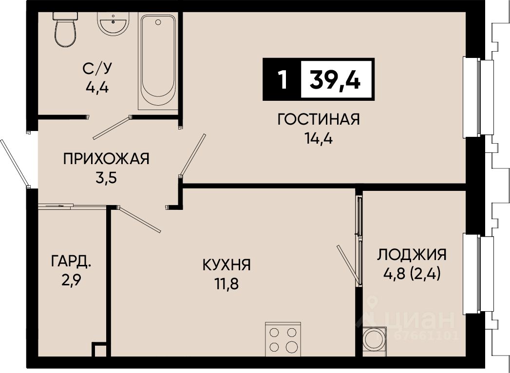 Общая площадь39,4 м²