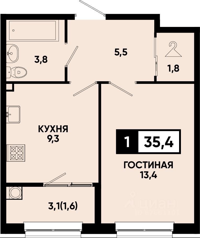 Общая площадь35,4 м²