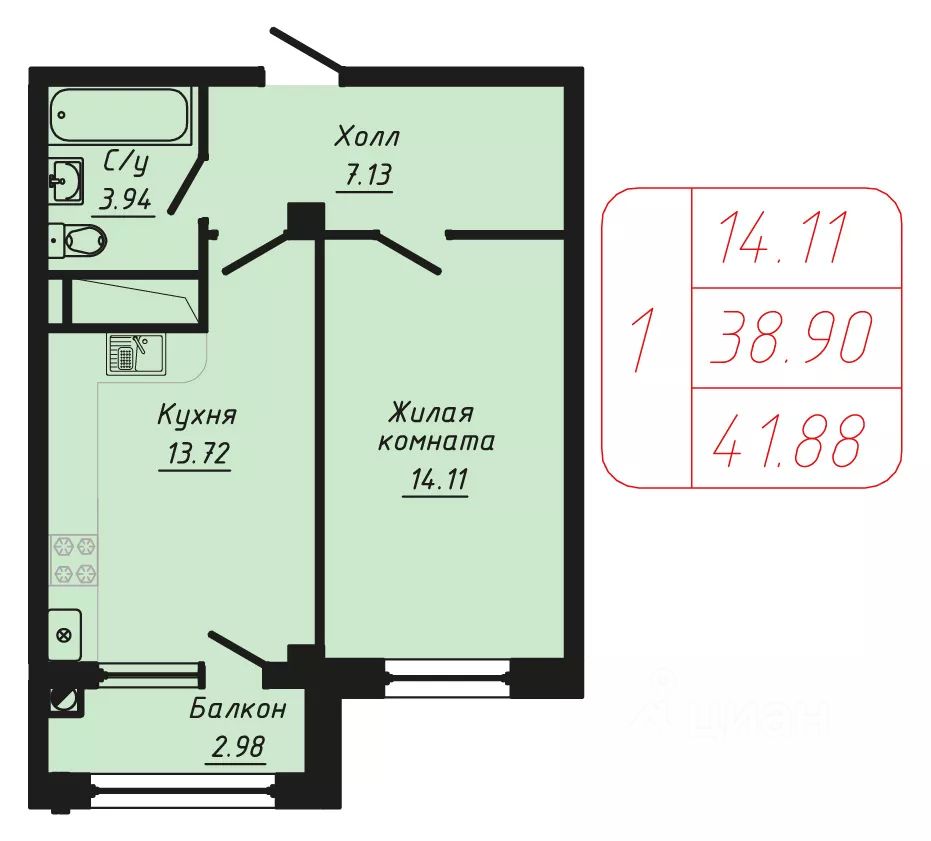 Продаётся 1-комнатная квартира в строящемся доме (Секции 4-5), срок сдачи: II-кв. 2028, общей площадью 41.88 кв.м., на 6 этаже.