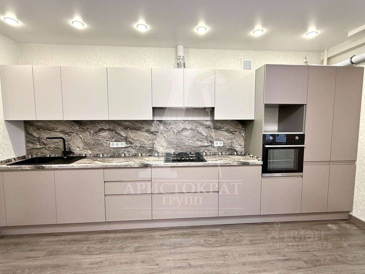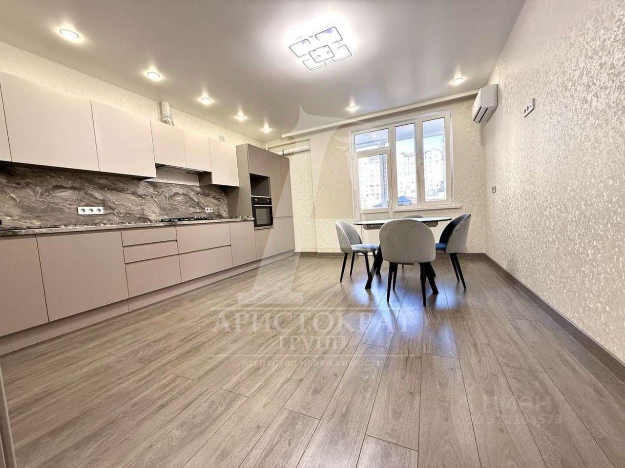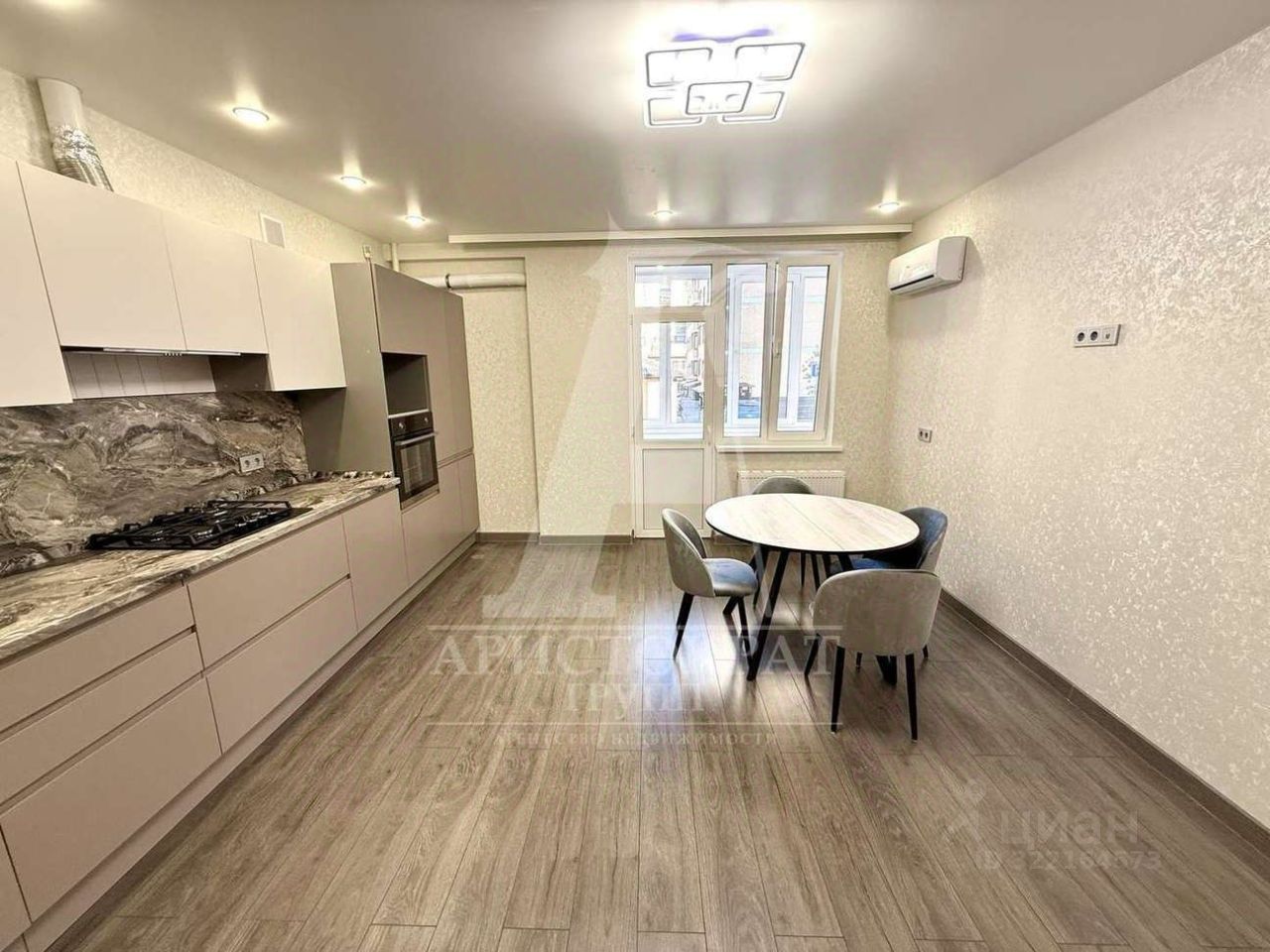 Квартира оснащена встроенной кухней с бытовой техникой , установлены кондиционеры , люстры .