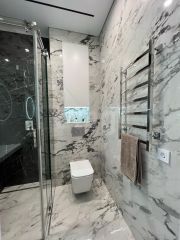 Санузел встроенная душевая система , инсталляция (Испания). В квартире никто не жил . В зале , кухне и санузле произведена укладка теплого пола.