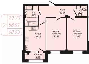 Продаётся 2-комнатная квартира в строящемся доме (Секции 6-10), срок сдачи: II-кв. 2028, общей площадью 60.99 кв.м., на 7 этаже.