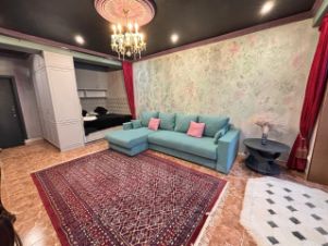 Уникальная однокомнатная квартира-театр, дизайн которой вдохновлен идеей питерского гламура, вольных гор Северного Кавказа с оттенками психоделики и философии единения с природой.