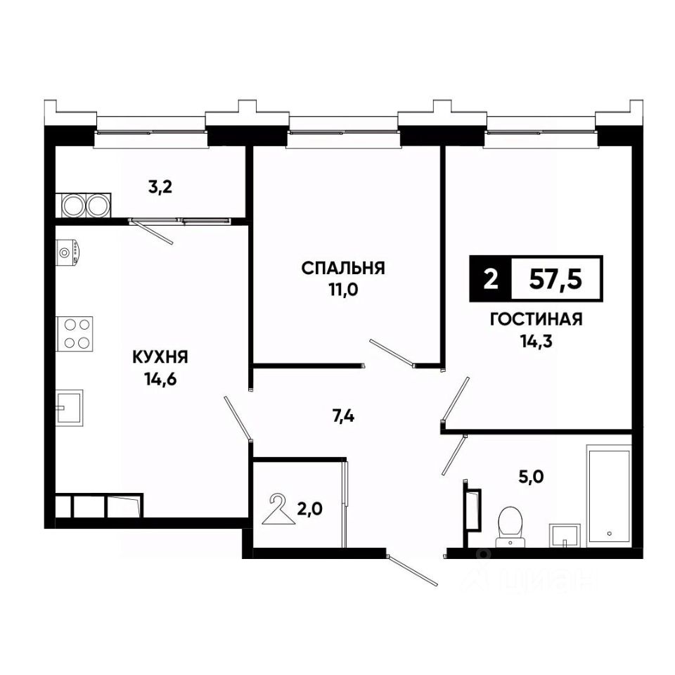 Общая площадь57,5 м²