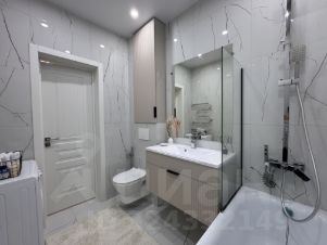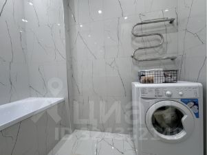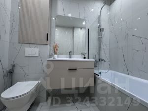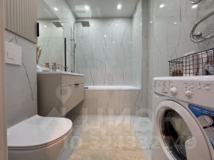 Санузел совмещенный, просторный. Унитаз инсталляция, гигиенический душ, стиральная машинка установлена и подключена, ванна со стеклом, установлен полотенцесушитель, зеркало с подсветкой также имеются дополнительные места хранения.
