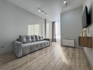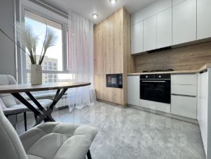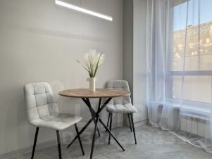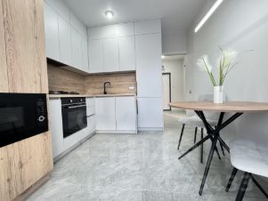 В комнате установлена сплитсистема, встроенный шкаф, встроенная кухня со всей необходимой техникой, стильная столовая группа, уютный раскладной диван, кровать с мягким изголовьем.