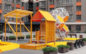 Современная детская площадка и спортивная зона с тренажерами