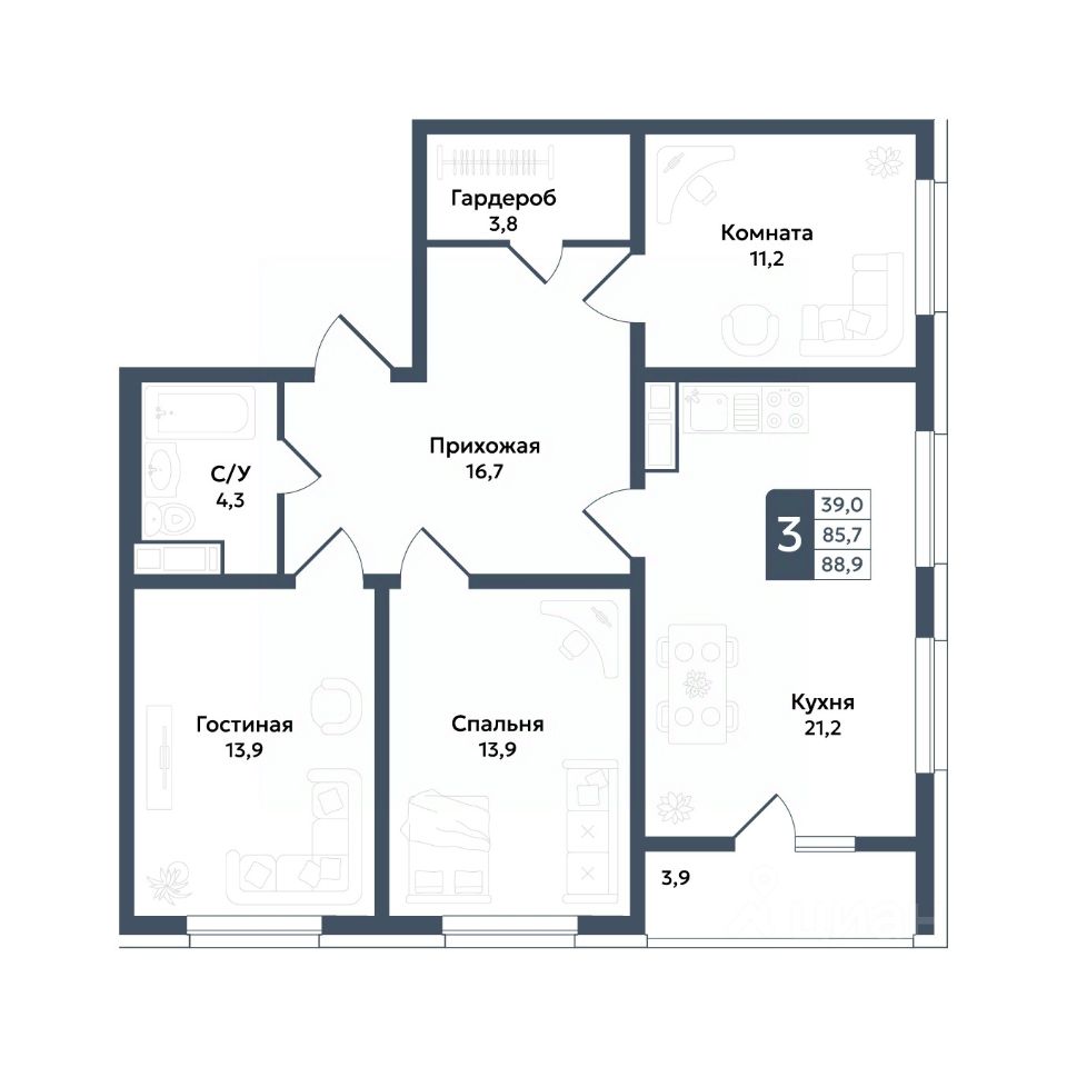 Общая площадь88,9 м²