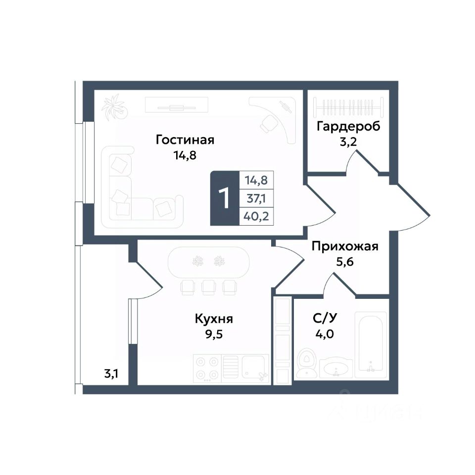 Общая площадь40,2 м²