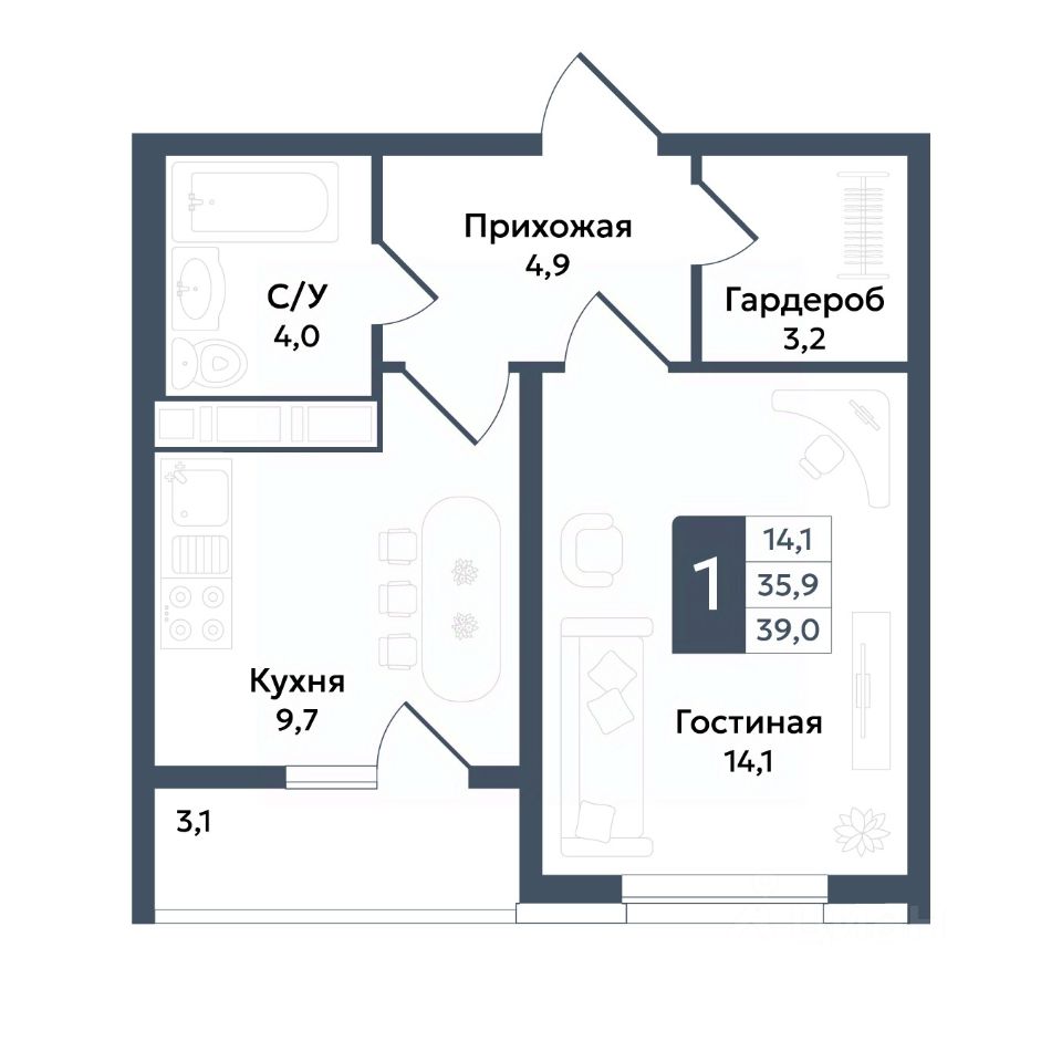 Общая площадь39 м²