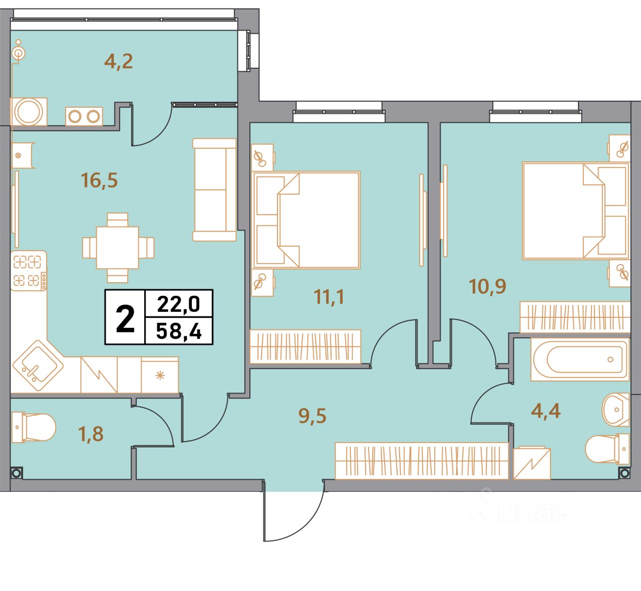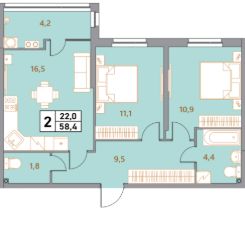 Общая площадь58,4 м²