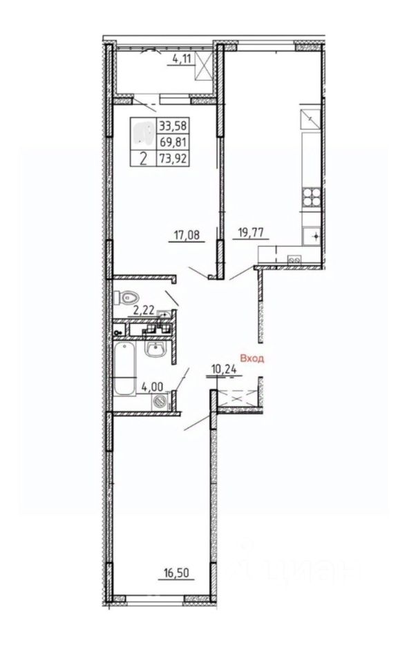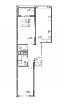 Продаётся 2-комнатная квартира в строящемся доме (Дом 1), срок сдачи: III-кв. 2027, общей площадью 73.92 кв.м., на 3 этаже.