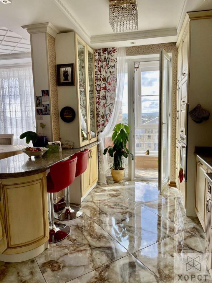 Общая площадь составляет 136,7 кв. м, кухня-гостиная впечатляющего размера - 40 кв. м. Панорамные балконы с видом на Эльбрус.