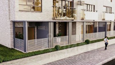 Закрытый двор с охраняемой территорией и умным разделением пространства: отдельные зоны отдыха для взрослых и игровые площадки для детей.