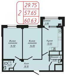 Продаётся 2-комнатная квартира в строящемся доме (Секции 1-3), срок сдачи: II-кв. 2028, общей площадью 60.63 кв.м., на 9 этаже.