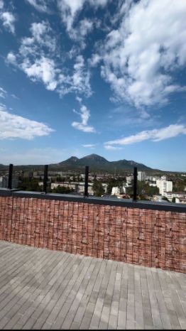 Одним из главных преимуществ этого дома является эксплуатируемая кровля, где размещены общие места для отдыха, откуда открывается великолепная панорама на гору Машук.