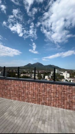Одним из главных преимуществ этого дома является эксплуатируемая кровля, где размещены общие места для отдыха, откуда открывается великолепная панорама на гору Машук.