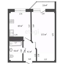 * Площадь: Общая 34.9 м², просторная жилая комната 17.3 м², уютная кухня 8.9 м².