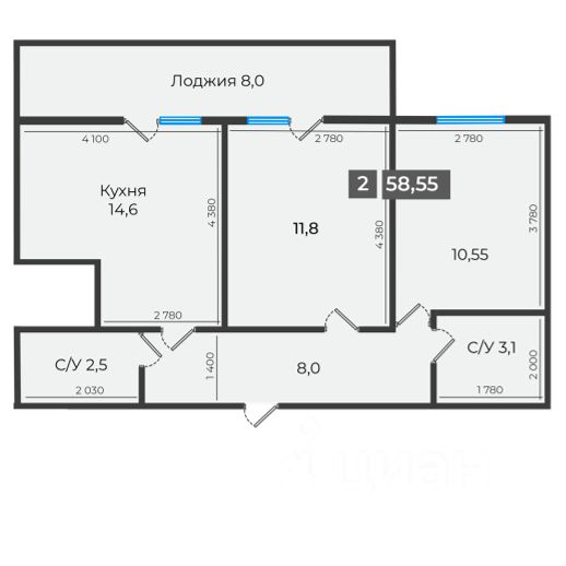 Общая площадь59,15 м²