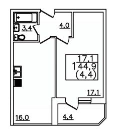 Продаётся 1-комнатная квартира в строящемся доме (Дом 1), срок сдачи: I-кв. 2026, общей площадью 44.9 кв.м., на 5 этаже.