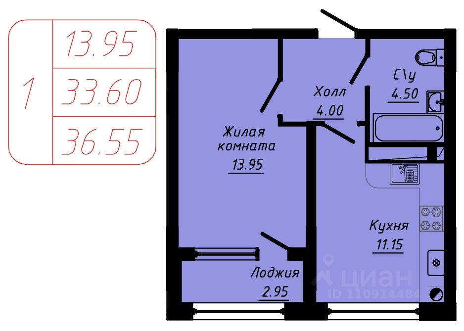 Продаётся 1-комнатная квартира в строящемся доме (3 этап), срок сдачи: III-кв. 2027, общей площадью 36.55 кв.м., на 5 этаже.