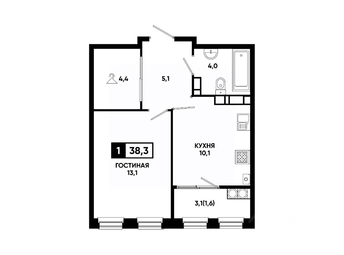 Общая площадь38,3 м²