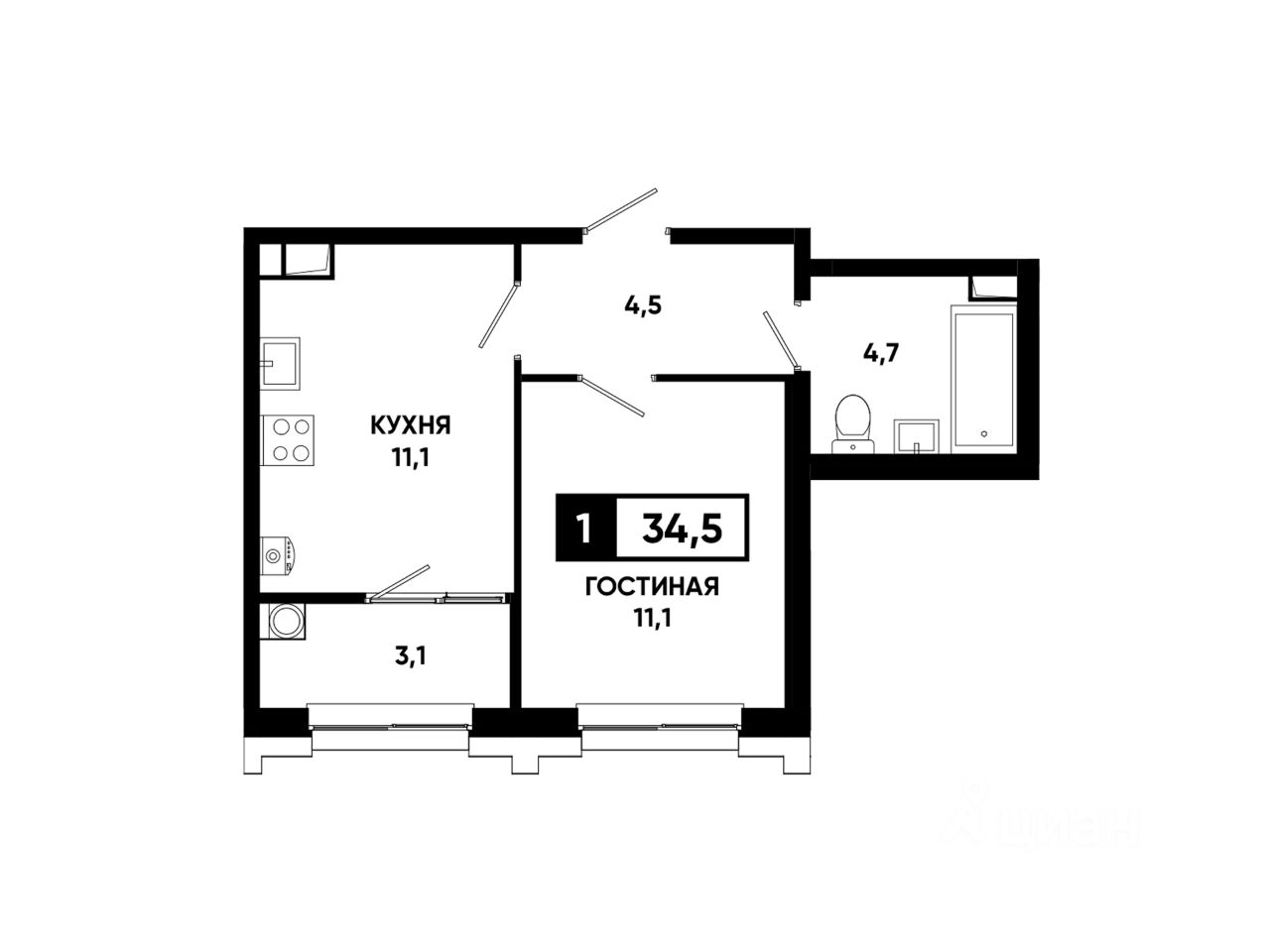 Просторная 1-комнатная квартира с кухней-гостиной и отдельной зоной для сна;
