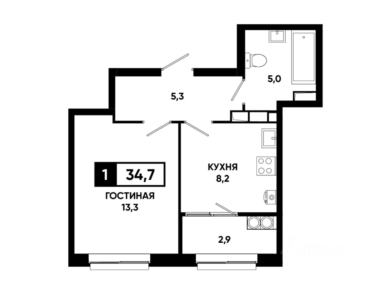 Общая площадь34,7 м²