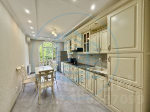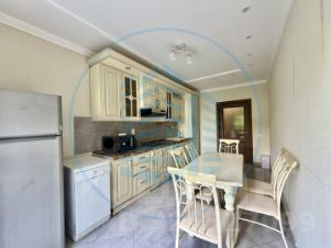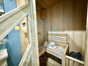 Просторный зал 28,3 кв.м. с достаточным количеством точечного освещения. Светлая спальня 22,7 кв.м. Кухня 24,1 кв.м. с французским балконом. Санузел с душевой кабиной, джакузи и сауной. Гостевой санузел (используется как кладовая), Гардеробная.