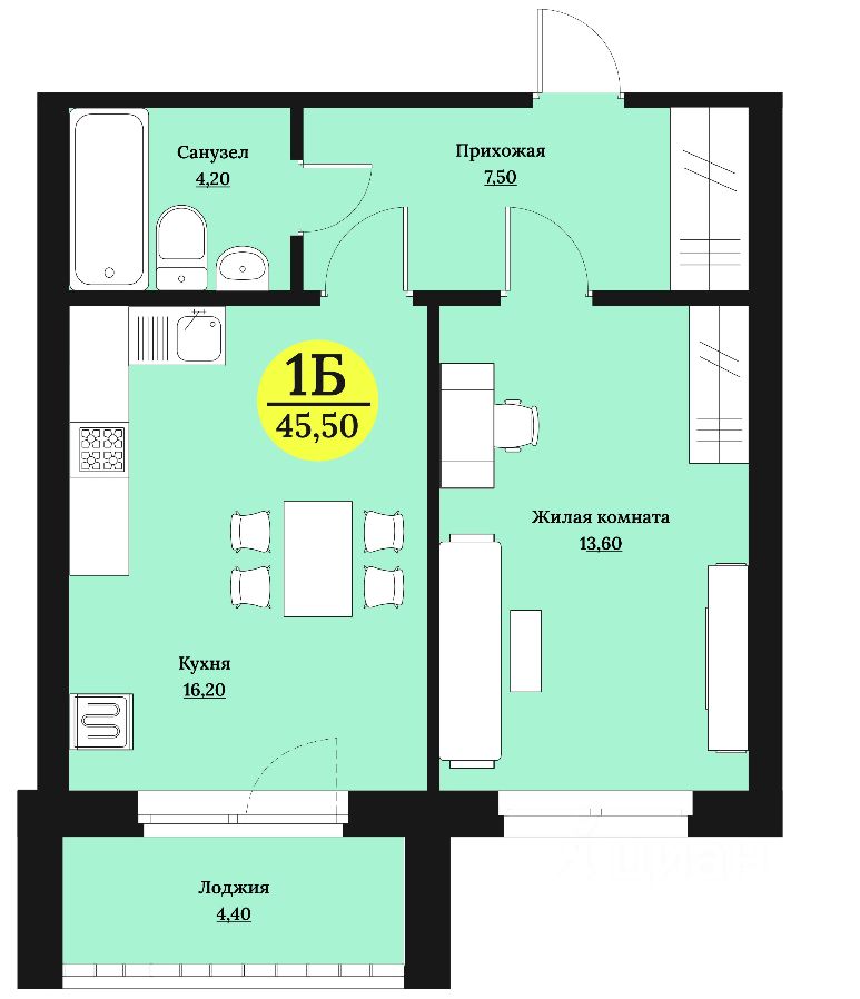 Общая площадь45,5 м²