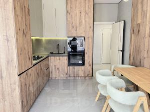 На кухне встроенный гарнитур, Установлены встроенный холодильник, микроволновая печь,духовой шкаф и варочная панель с вытяжкой, посудомоечная машина.