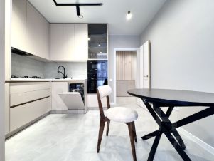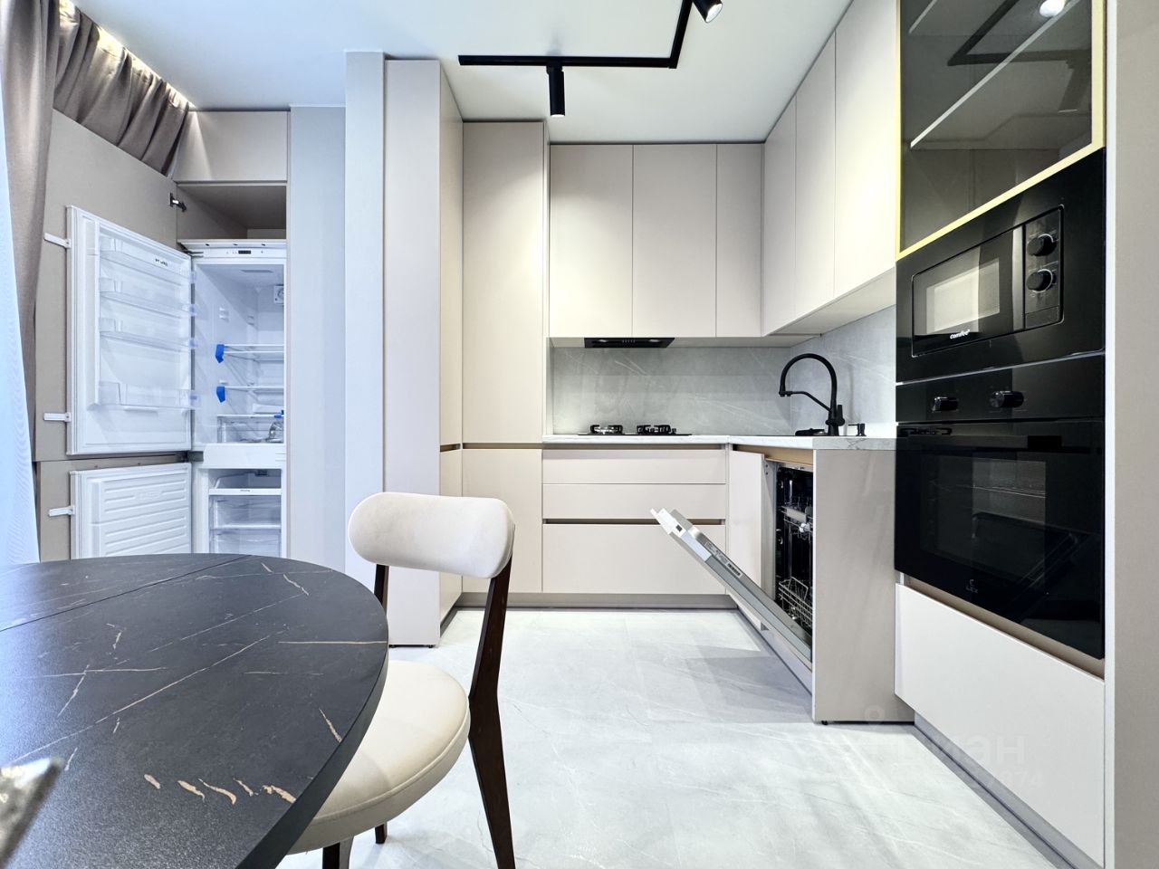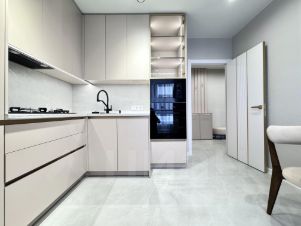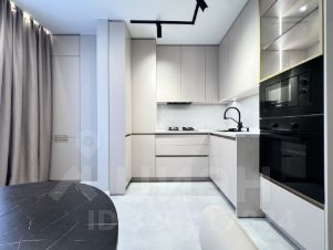 на кухне качественный гарнитур с доводчиками со встроенный техникой.