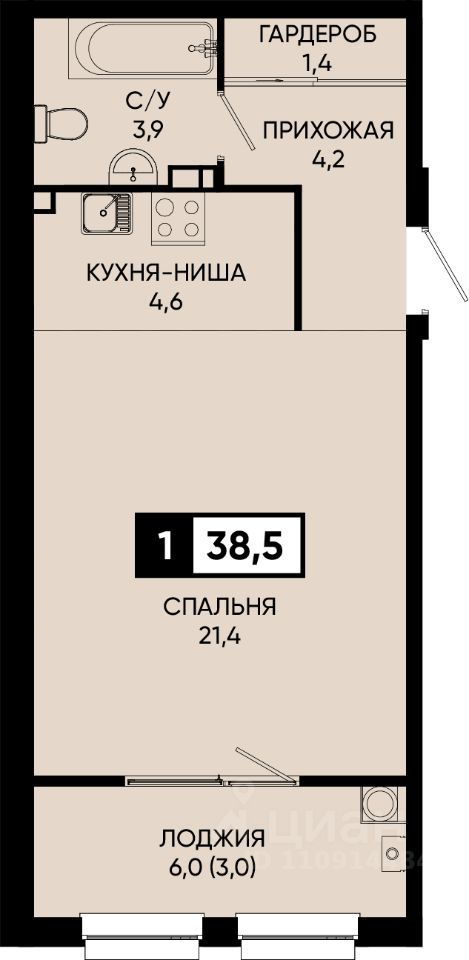 Общая площадь38,5 м²