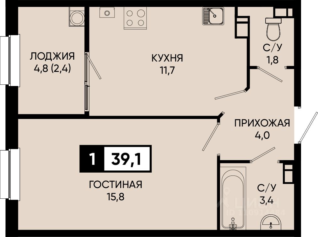 Общая площадь39,1 м²