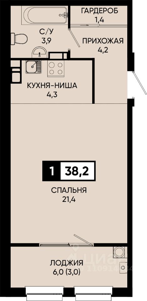 Общая площадь38,2 м²