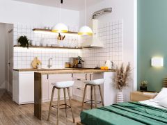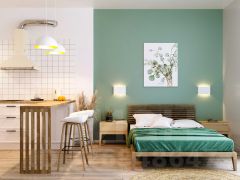 Просторная спальня и отдельная кухня-гостиная — продуманное разделение зон для жизни и отдыха;