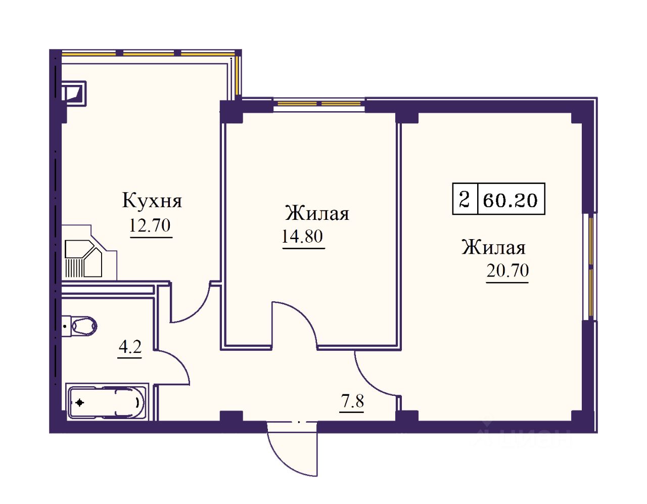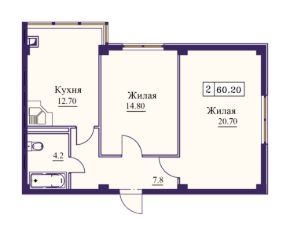 Продаётся 2-комнатная квартира в строящемся доме (Дом 1 этап 1), срок сдачи: I-кв. 2027, общей площадью 60.2 кв.м., на 2 этаже. Расположение, транспортная доступность