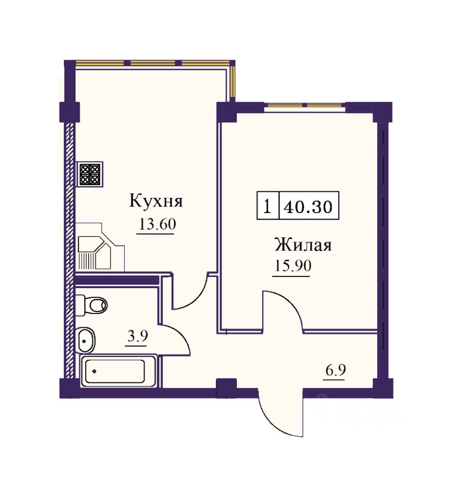 Продаётся 1-комнатная квартира в строящемся доме (Дом 1 этап 2), срок сдачи: III-кв. 2027, общей площадью 40.3 кв.м., на 2 этаже. Расположение, транспортная доступность