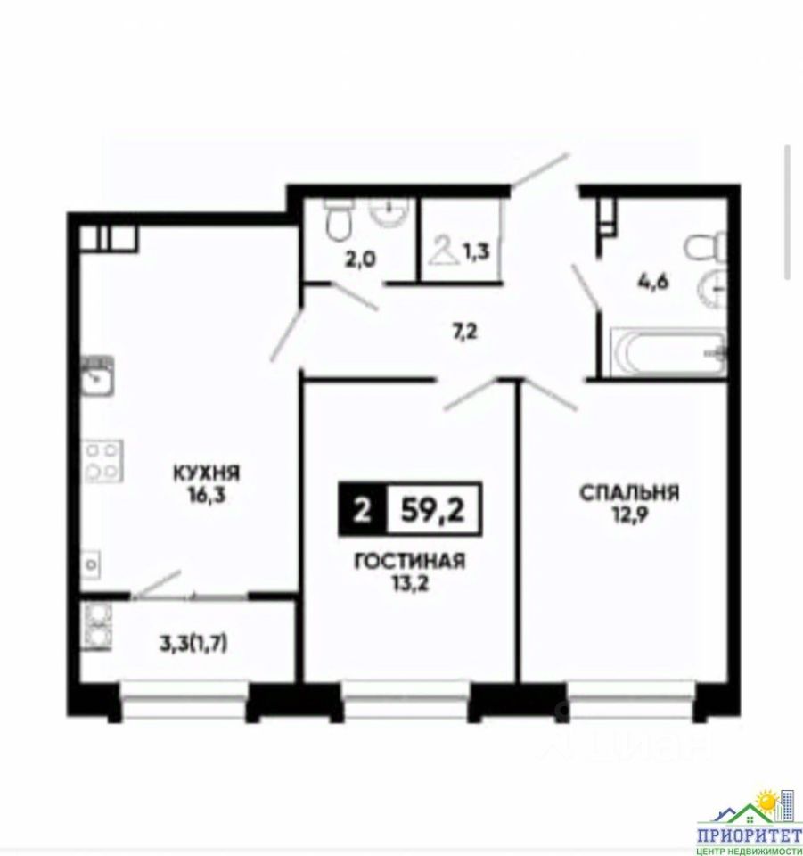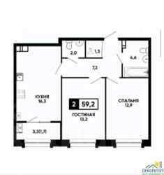 Квартира расположена на 3 этаже 6-этажного нового дома. Общая площадь составляет 59,20 м², из которых 16,30 м² приходится на просторную кухню. Комнаты раздельные, что создает комфортные условия для жизни. Два санузла раздельный и совмещенный, имеется балкон.